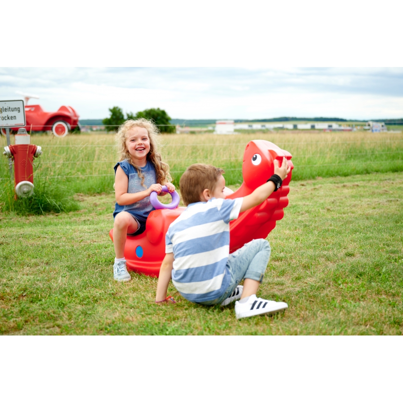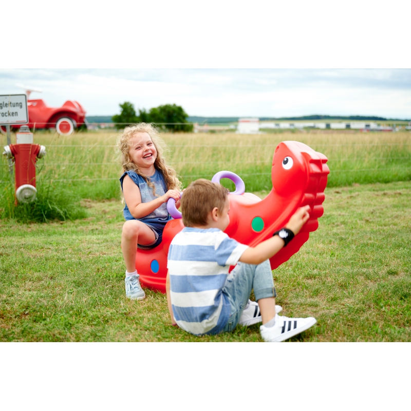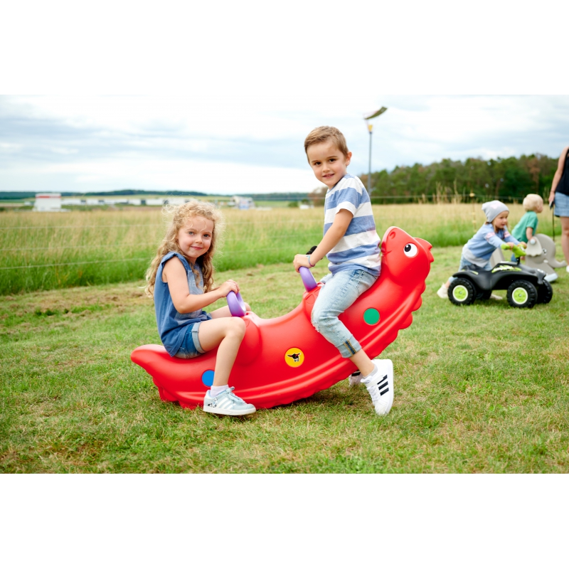Bujak Wieloosobowy Dinozaur marki BIG jest prawdziwą gwiazdą wśród dzieci! Z bujaka może korzystać maksymalnie troje dzieci jednocześnie, a nawet jedno będzie się świetnie bawić. Gdy dzieci bujają się we dwójkę to dodatkowo rozwija u nich zdolności do współpracy. Solidne uchwyty zapewnią bezpieczeństwo a łuski na grzbiecie dinozaura zapobiegną zbyt gwałtownemu kołysaniu. Bujanie samo w sobie uspokaja dziecko oraz rozwija zdolności motoryczne ciała, co jest idealne dla prawidłowego rozwoju. Z huśtawki można korzystać zarówno w domu jak, i na zewnątrz!