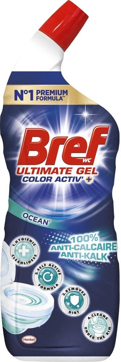 Bref Ultimate Gel Color Active + Ocean to innowacyjny żel do czyszczenia toalety, który zapewnia skuteczną walkę z uporczywymi zabrudzeniami, kamieniem oraz przebarwieniami. Dzięki swojej zaawansowanej formule o natychmiastowym działaniu, żel skutecznie usuwa zanieczyszczenia, zapewniając higienę i nieskazitelną czystość. Unikalna technologia zmiany koloru potwierdza aktywne działanie produktu, co sprawia, że czyszczenie toalety staje się prostsze i bardziej efektywne.