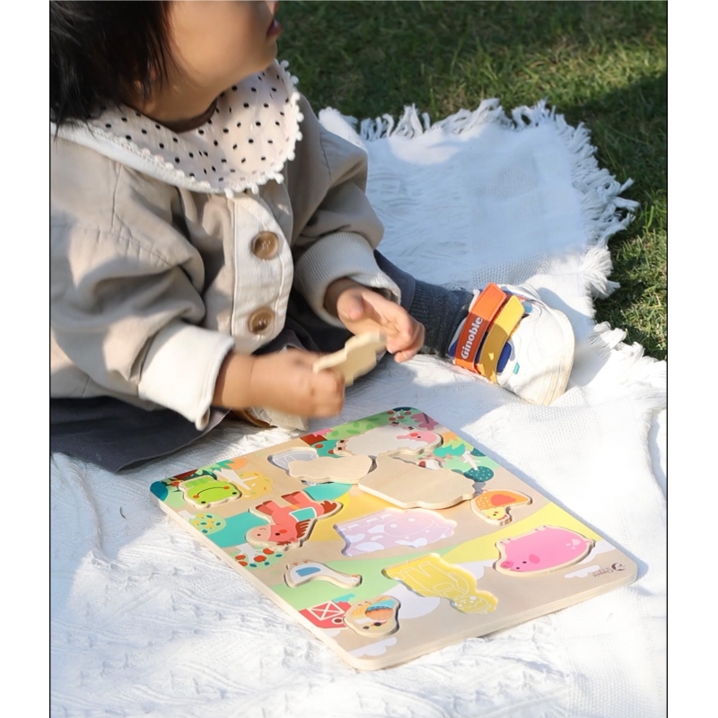 Kolorowa układanka z motywem farmy, zawiera drewniane figurki zwierząt do dopasowania na planszy. Wykonana z bezpiecznego drewna, rozwija zdolności manualne, koordynację ręka-oko, wyobraźnię oraz uczy rozpoznawania zwierząt.