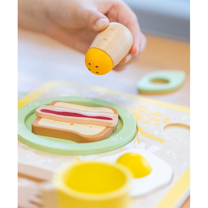 - – zestaw zawiera talerzyk, sztućce, kubek, sól, pieprz, jajko, tosty, plaster bekonu, serwetkę oraz tackę do serwowania,