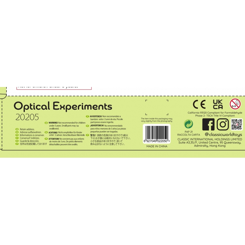 Zestaw Eksperymenty Optyczne od marki Classic World, to świetny pomysł na prezent dla twojego dziecka. Produkty wysokiej jakości, z dopracowane w każdym aspekcie produkcji, wprowadzą dzieci w magiczny świat iluzji optycznych. Zestaw zawiera 16 różnych elementów, a każdy z nich zaskoczy twoje dziecko! Zachęcanie do eksploracji, kreatywność i praktyczna nauka, jest to nieocenione narzędzie dla początkujących naukowców i młodych uczniów, zaszczepiające miłość do radości odkrywania! Ta zabawka płynnie łączy estetykę z badaniami naukowymi, dzięki czemu jest zarówno urzekająca wizualnie, jak i stymulująca intelektualnie.