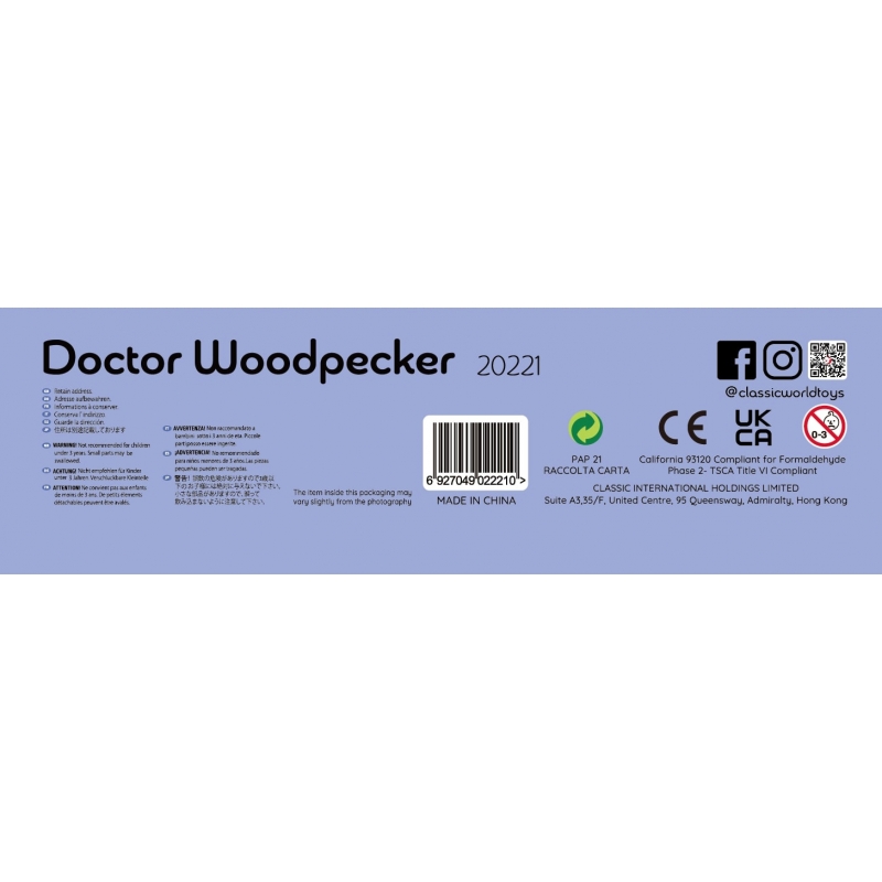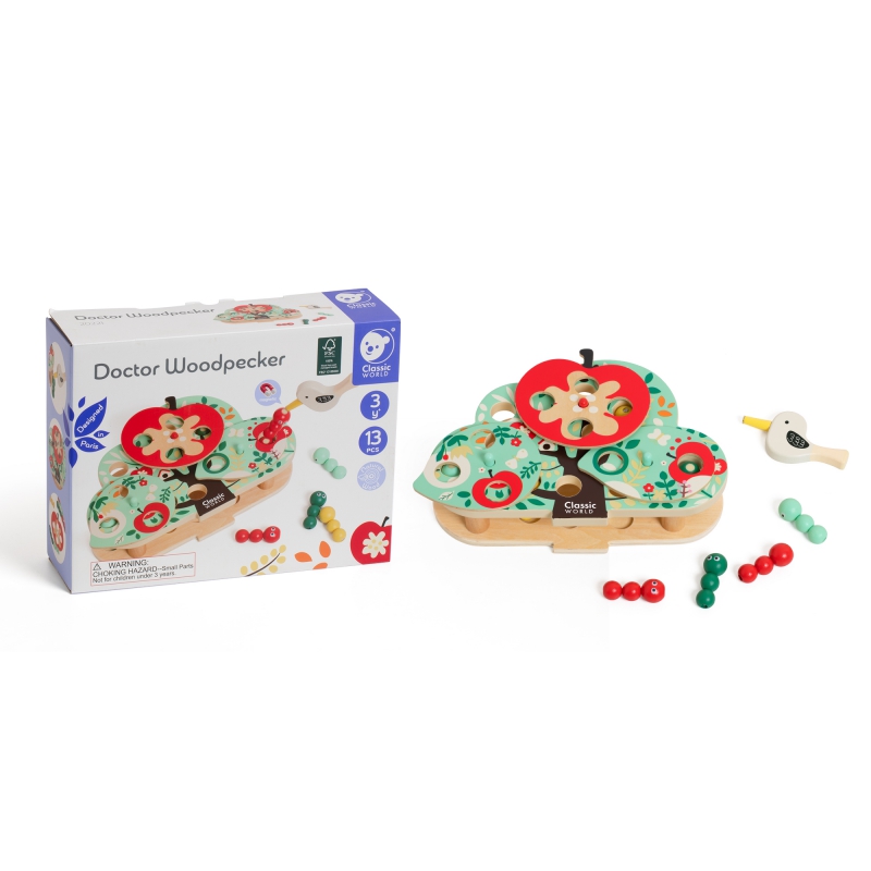 Interaktywny dzięcioł od marki CLASSIC WORLD pozwala dzieciom zachowywać się jak małe, odważne dzięcioły, machając skrzydłami i przewracając liście oraz owoce, aby znaleźć ukryte robaki w odpowiednich dziurkach. Jest to doskonała zabawka do ​​koordynacji ręka-oko dziecka i umiejętności obserwacji.