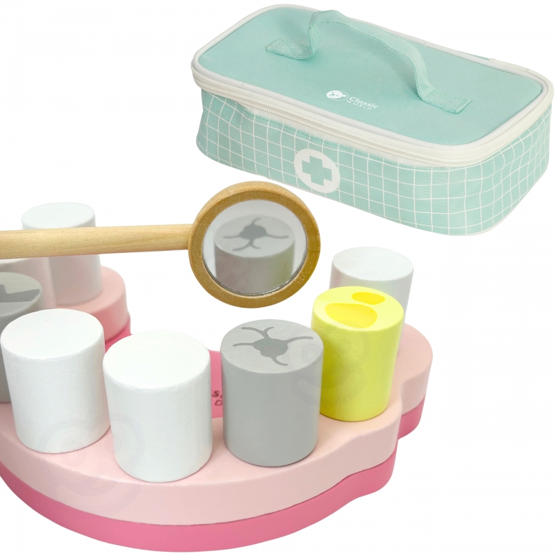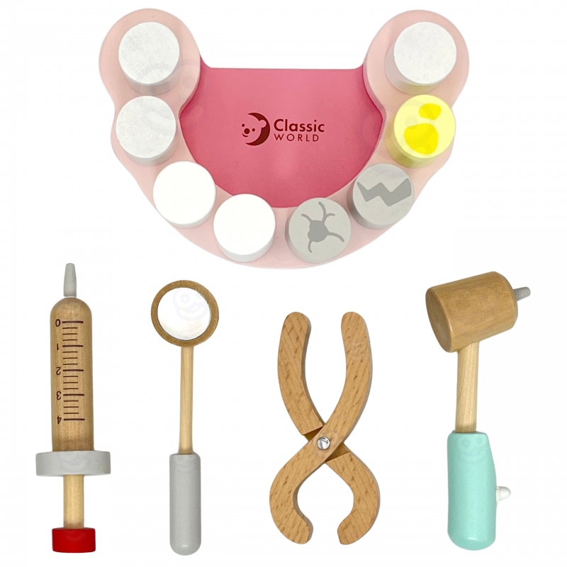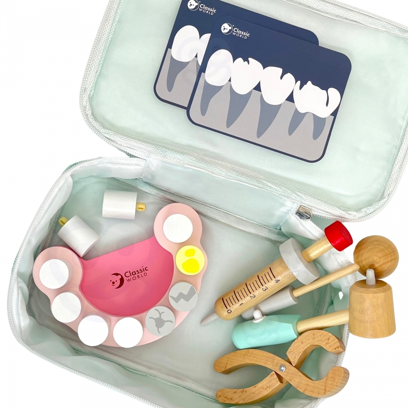 Drewniane narzędzia w torbie dla małego dentysty od marki CLASSIC WORLD. Ten zestaw zawiera wszystko, czego potrzebuje Twój mały Lekarz do zabawy w dentystę. Przyszli lekarze mogą robić zastrzyki, wyrywać oraz sprawdzać stan zębów u swoich pacjentów. Zabawa w Dentystę to nie tylko jedna z zabaw na odgrywanie ról, to również nauka dbania o higienę oraz skutki jej braku. Uczy także empatii i współodczuwania, co bardzo ważne w relacjach społecznych. Wspiera rozwój wyobraźni i uczy rozwiązywania problemów.