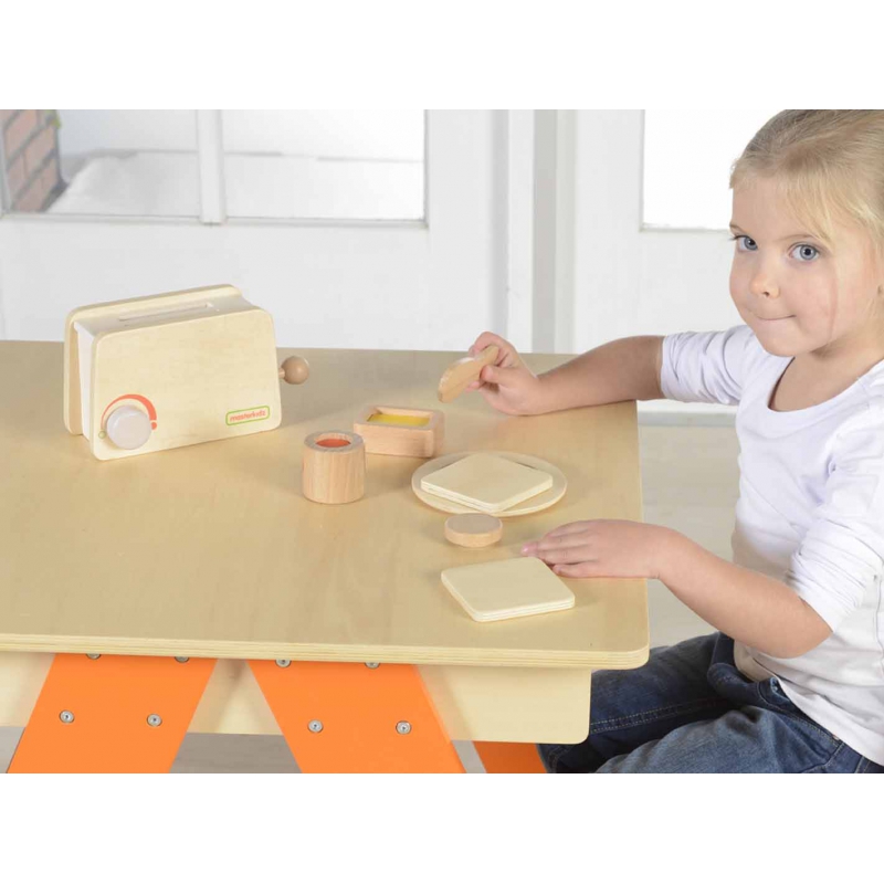 Zabawka sensoryczna edukacyjna, drewniany toster marki Masterkidz wraz z zestawem dodatków to świetna zabawka, która sprawdzi się jako akcesorium do kuchni dla dzieci. Zestaw zawiera wszystko, co jest niezbędne do zrobienia przepysznych tostów: toster z pokrętłem i dźwignią, kromkę chleba, masło, dżem, nożyk i talerz.