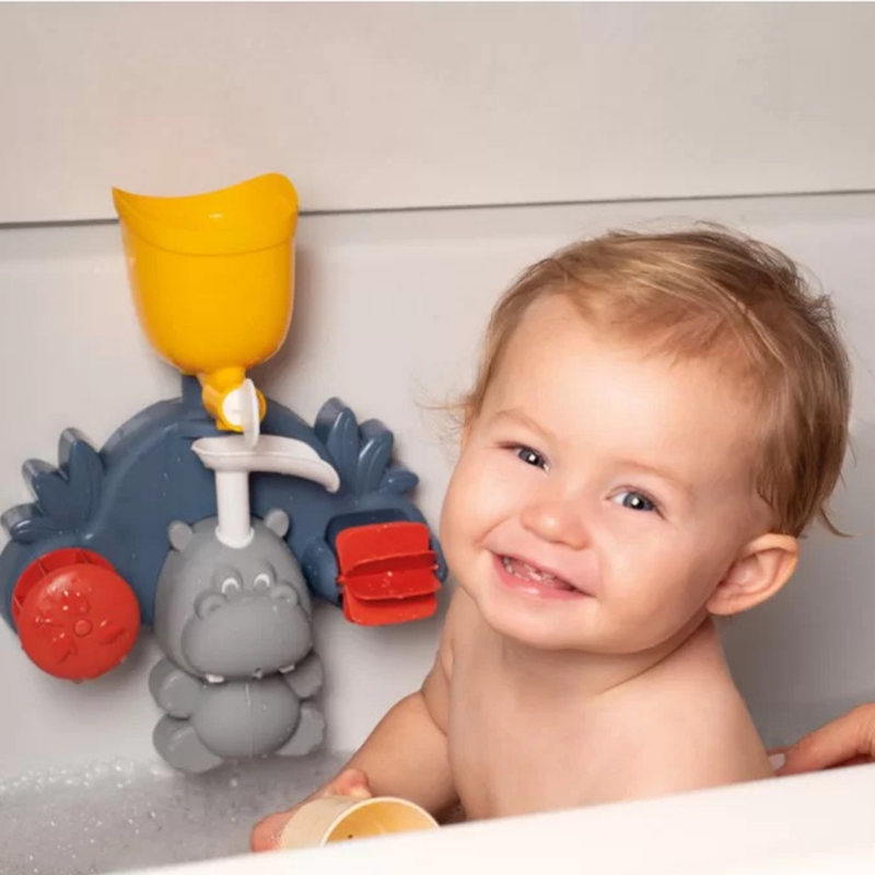 Przyjemna kąpiel Twojego maluszka staje się jeszcze bardziej urocza dzięki zabawce do kąpieli w kształcie hipopotama. Ten kolorowy gadżet do zamocowania na ściance wanny lub pod prysznicem przynosi czystą radość podczas wieczornej pielęgnacji! Dziecko może korzystać z trzech różnych kubeczków, aby napełniać żółty zbiornik i kierować strumień wody w jednym z trzech kierunków. Maluch może obserwować, jak woda napędza obrotowe koła. Ta interaktywna zabawa angażuje dziecko motorycznie. Zabawka jest idealnie dostosowana do małych rączek małych odkrywców, oraz spełnia standardy bezpieczeństwa.