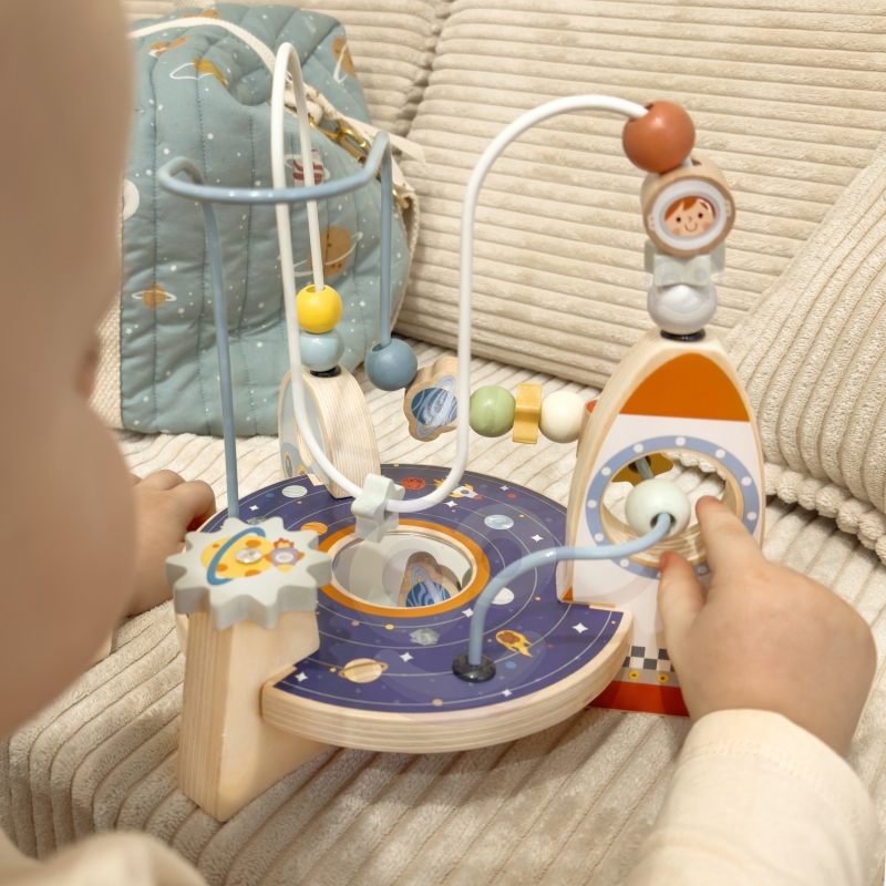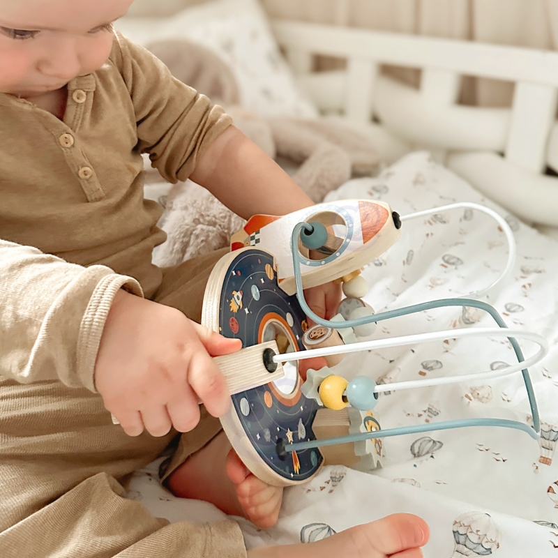 - – Ruchome elementy: Koraliki, gwiazdki i planety na pętlach, które dziecko może przesuwać