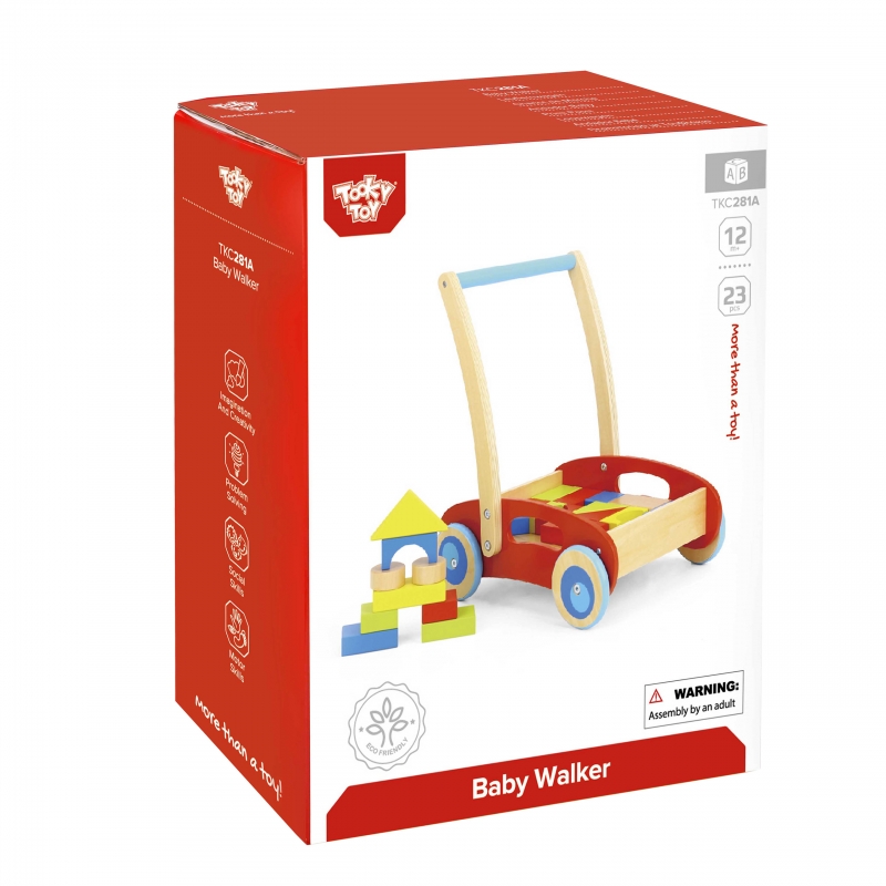 Piękny drewniany pchacz marki Tooky Toy z klockami to idealny pomocnik w stawianiu pierwszych kroków. Wózek z Klockami pomaga utrzymać równowagę, przyspiesza naukę chodzenia. Sprawdzi się również jako pchacz podczas pierwszych spacerów. Rączka umieszczona jest na takiej wysokości, aby ułatwić dziecku pchanie wózeczka. Układanie, przewożenie i rozrzucanie klocków rozwija wyobraźnię, sprawność manualną, koordynację wzrokową i kreatywność. Klocki mogą być bardzo przydatne przy nauce matematyki i rozpoznawania kolorów. Zabawa klockami umożliwia rozwijanie zdolności poznawczych oraz naukę zależności przyczynowo – skutkowych.