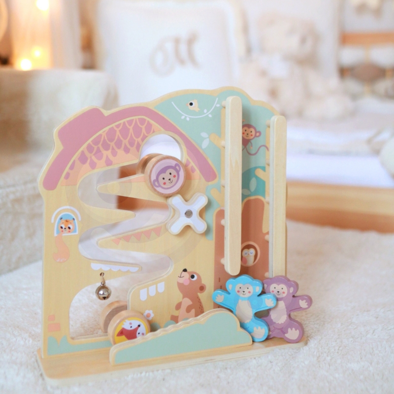 W centrum zabawy znajduje się leśny domek otoczony przyrodą, tętniący życiem małych zwierzątek. Dwie radosne, kolorowe małpki czekają na pomoc dziecka, aby zejść ze szczytu drzewa. Tymczasem Królik i Lisek przygotowali się do wyścigu, a zadaniem dziecka jest pomóc im na starcie. Zabawa kończy się miłym dźwiękiem dzwoneczka, który jednocześnie pobudza percepcję słuchową dziecka.
