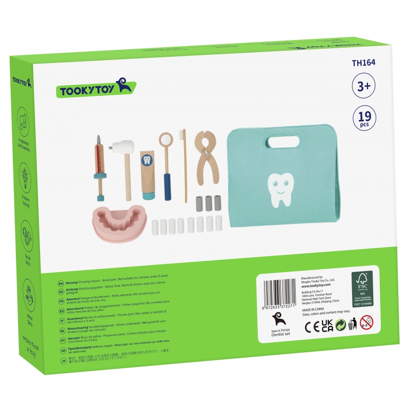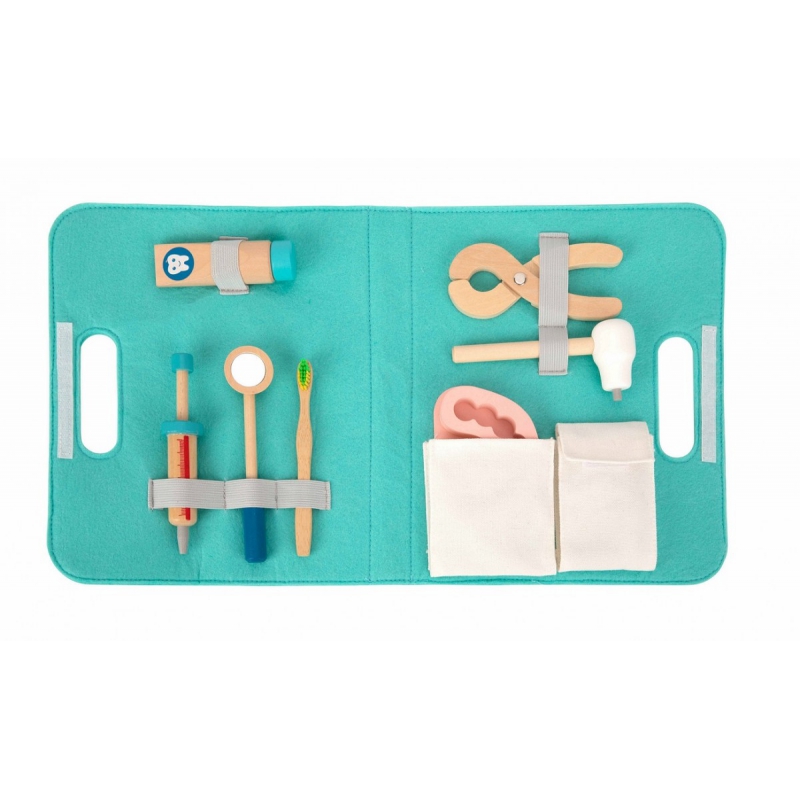 Drewniane narzędzia w torbie dla małego dentysty od marki TOOKY TOY. Ten zestaw zawiera wszystko, czego potrzebuje Twój mały lekarz do zabawy w dentystę. Przyszli lekarze mogą robić zastrzyki, wyrywać oraz sprawdzać stan zębów u swoich pacjentów. Zabawa w Dentystę to nie tylko jedna z zabaw na odgrywanie ról, to również nauka dbania o higienę oraz skutki jej braku. Uczy także empatii i współodczuwania, co jest bardzo ważne w relacjach społecznych. Wspiera rozwój wyobraźni i uczy rozwiązywania problemów.