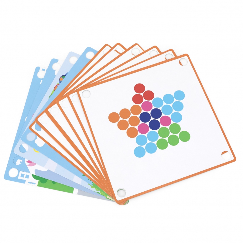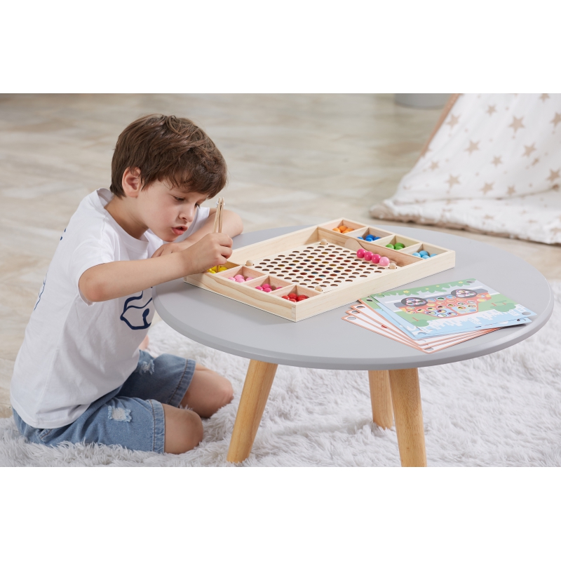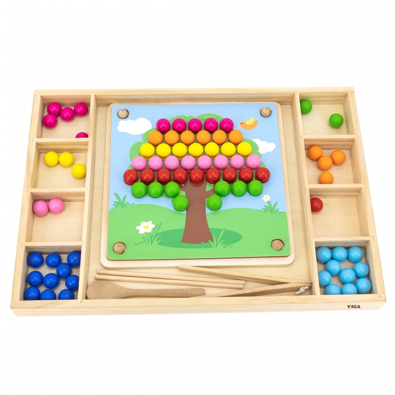 Drewniana gra „Złap i dopasuj” marki Viga. Zadanie dzieci jest nie tylko dopasowywać kolory według wzoru na papierze, ale także tworzyć więcej wzorów dzięki swojej wyobraźni. Ta gra może ćwiczyć koordynację ręka-oko i koncentrację dziecka. Dzieci mogą przymocować ulubiony papier do drewnianej tacy. Za pomocą pałeczek, łyżki lub spinacza przyczepić kulki do otworów na desce według wzorów i kolorów, a na koniec ułożyć je w piękny obrazek.