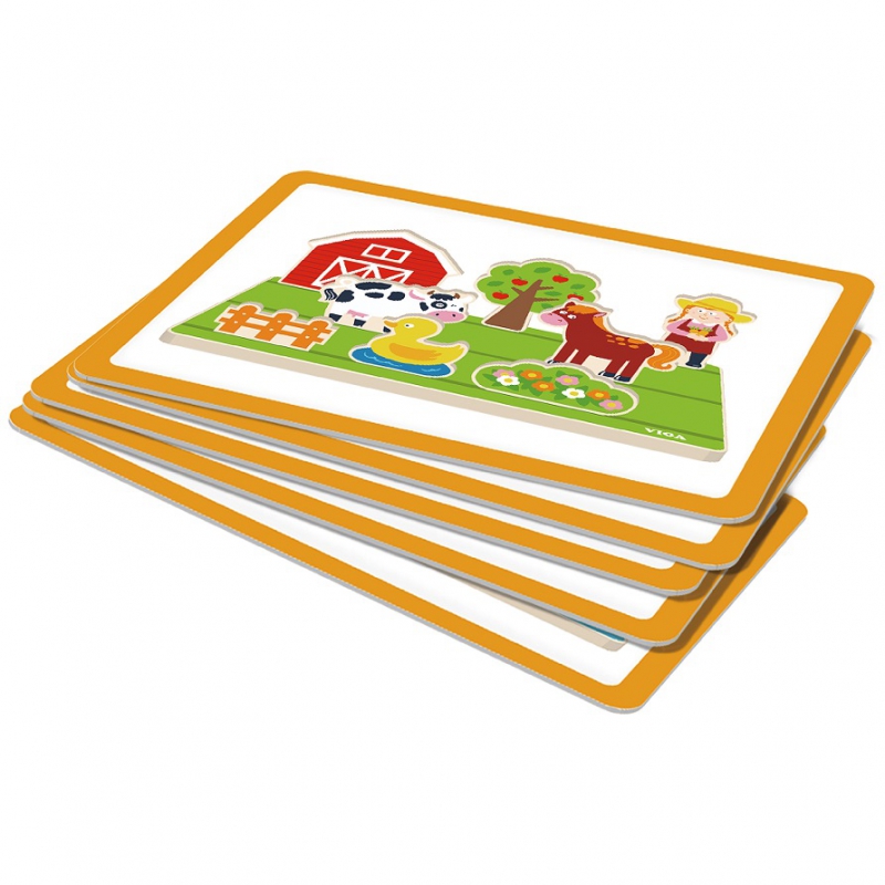 • drewniane elementy do układania farmy: stodoła, płotek, dziewczynka, jabłoń, krówka, kogut, rabata z kwiatami, kaczka, konik, traktor z rolnikiem,