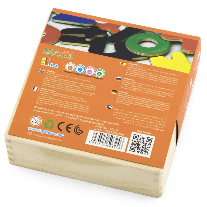 - – literki magnetyczne są zapakowane w estetyczne, drewniane pudełko z przeźroczystą akrylową szybką co ułatwia przechowywanie i jest idealne na prezent,
