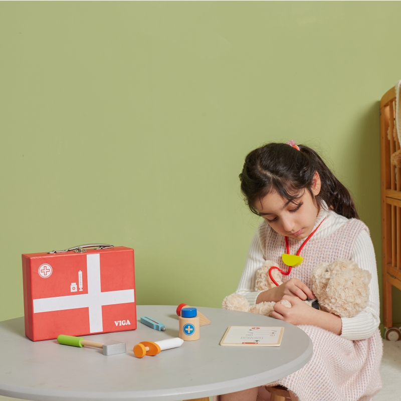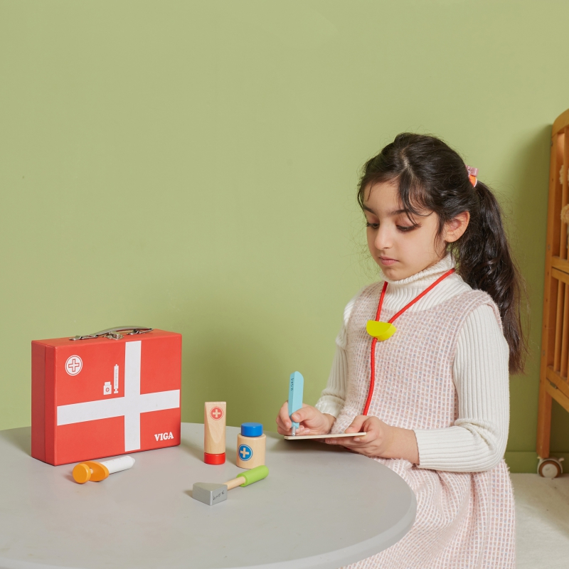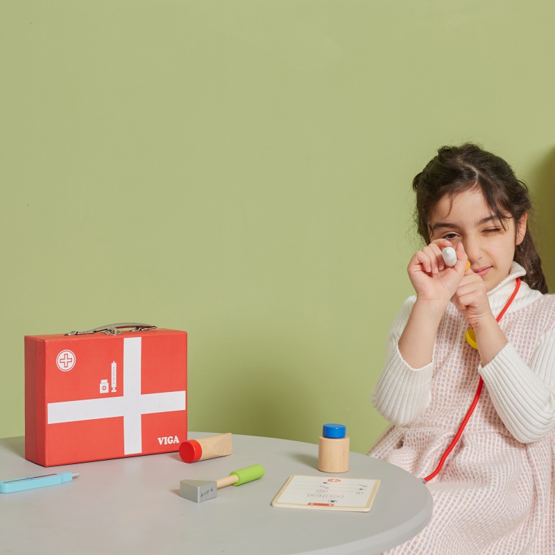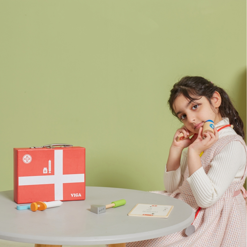 Zestaw Viga zawiera wszystko, czego potrzebuje Twój mały Lekarz do zabawy w doktora. Przyszli lekarze, lekarki, pielęgniarze i pielęgniarki mogą słuchać bicia serca pacjentów (misiów, lalek) za pomocą stetoskopu, „mierzyć” im temperaturę termometrem, „robić” zastrzyki czy wypisać kartę pacjenta. Zabawa w Doktora to nie tylko jedna z zabaw na odgrywanie ról, to również nauka empatii i współodczuwania, co jest bardzo ważne w relacjach społecznych. Wspiera rozwój wyobraźni i uczy rozwiązywania problemów. Zestaw pomoże przezwyciężyć strach przed lekarzem.
