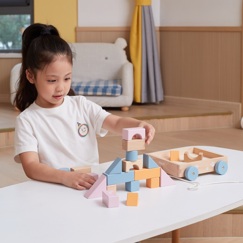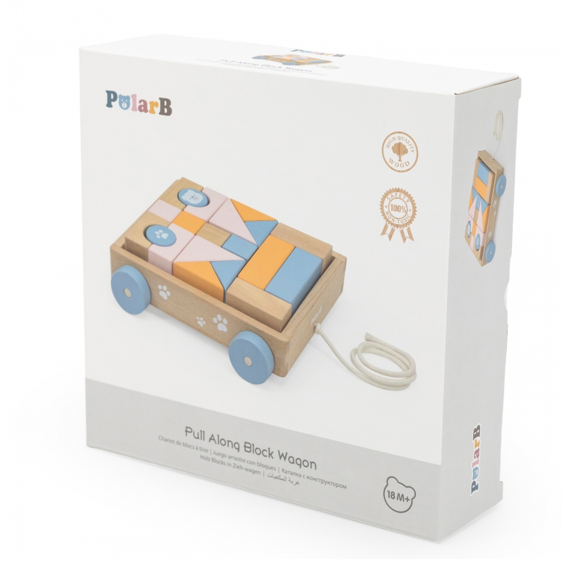 Drewniany Wózek do Ciągnięcia od marki VIGA PolarB to klocki w pastelowych kolorach, umieszczone na wygodnym wózeczku. Dzięki 20-częściowym drewnianym bryłom można tworzyć fantazyjne budynki dzięki różnym kształtom, kolorom i odciskom. Umiejętności motoryczne i kreatywność są wspierane przez zabawę drewnianymi elementami konstrukcyjnymi. Budynki są wykonane z drewna bukowego, lakierowane, w harmonijnych kolorach i zabezpieczone przed dziećmi. Po zakończeniu gry, klocki mogą być posortowane z powrotem do wózka i w mgnieniu oka wszystko jest znowu uporządkowane. Za pomocą sznureczka dziecko może ciągnąć wózeczek z posortowanymi klockami po podłodze.