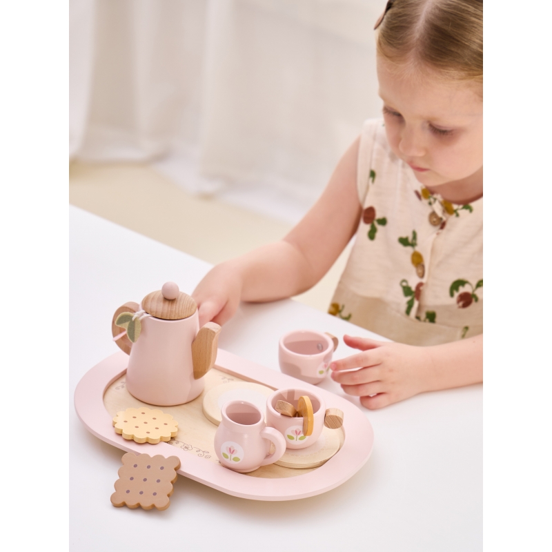 - – Zestaw zawiera dzbanek, 2 filiżanki z podstawkami, mlecznik, torebki herbaty, łyżeczki, plasterki owoców, ciasteczka i tackę do serwowania