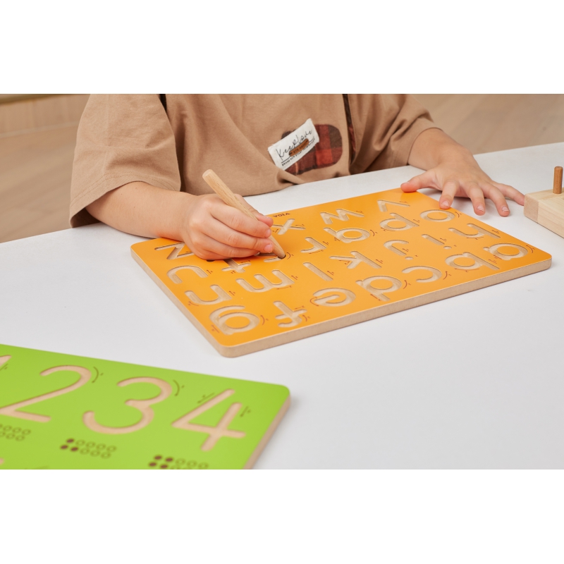 Tablica kreślarska od marki VIGA to idealna propozycja dla dzieci do trenowania rączki przed nauką pisania. Delikatnie wygrawerowane i zakrzywione rowki sprawiają, że idealnie nadaje się dla dzieci do kontrolowania ruchu dłoni i kształtowania pamięci mięśniowej poprzez wielokrotne śledzenie. Każda litera jest oznaczona strzałkami, co pomaga dzieciom w prawidłowej kolejności pisania. Tablica jest dostępna w kompaktowych rozmiarach, dzięki czemu dzieci mogą ją trzymać i używać na stole lub biurku.Dziecko poprzez zabawę uczy się ruchów odpowiedzialnych w przyszłości za rysowanie i pisanie, kształci płynność ruchów oraz ćwiczy koordynację wzrokowo – ruchową.