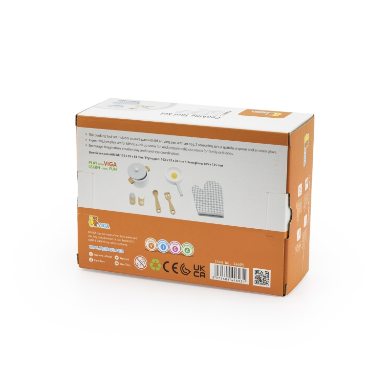 Zestaw do gotowania marki Viga, to świetny zestaw do zabawy w kuchnię dla dzieci, dzięki któremu możesz przygotować zabawne posiłki dla rodziny i przyjaciół. Zabawka zachęca do wyobraźni, kreatywnej zabawy i koordynacji ręka – oko. Zestaw zawiera rondelek z pokrywką, patelnię z jajkiem, 2 pojemniczki na przyprawy, szpatułkę, łyżkę i rękawicę kuchenną.