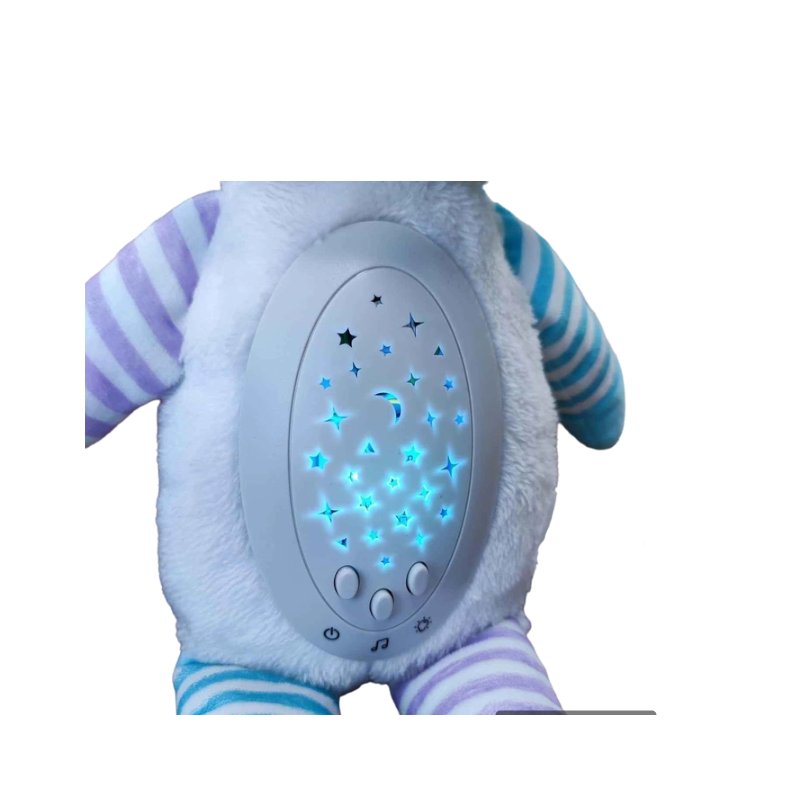 - – Efekty świetlne i dźwiękowe – melodie/kołysanki pomagające zasnąć + projektor zmieniający 6 kolorów, pokazuje na ścianie obraz pięknych gwiazdek.