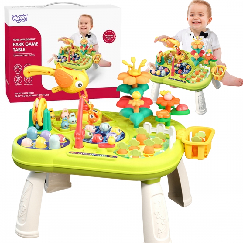 Interaktywny multistolik edukacyjny od marki WOOPIE to wyjątkowy zestaw gier i zabawek, który zapewnia nie tylko rozrywkę, ale także rozwój umiejętności Twojego dziecka. Stolik dzięki swojej wielofunkcyjności pozwala dziecku na różnorodną zabawę i gwarantuje, że zabawka nie będzie się nudzić, ponieważ ma do zaoferowania wiele aktywności: łowienie rybek, wbijania robaczków młoteczkiem, zabawy w ogród czy zabawy z dzięciołem w wyciąganie robaczka. Te wszystkie zabawy pozwalają dziecku na spokoje oswajanie się z powierzonymi mu zadaniami, uczą cierpliwości oraz usprawniają rączki. Dziecko podczas zabawy wycisza się oraz pracuje nad swoją małą motoryką. Zabawka zapewnia interaktywną i angażującą zabawę, która rozwija wyobraźnię, spostrzegawczość i umiejętności interpersonalne dziecka, umożliwiając mu eksplorowanie świata wokół siebie.
