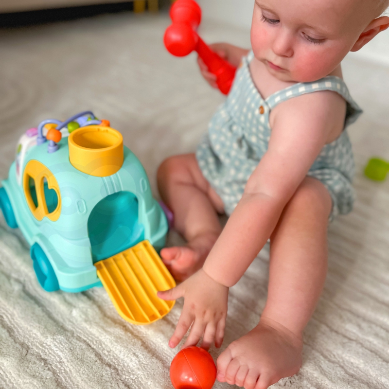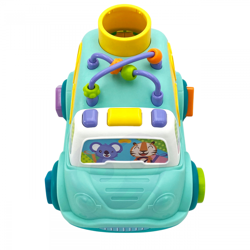 Samochodzik ma wiele elementów do manipulowania i odkrywania. Dziecko może używać dołączonego młoteczka , aby wbijać kolorowe piłeczki do wnętrza samochodzika. Piłeczki będą potem wylatywać przez tylną klapę pojazdu, co dostarczy dziecku dodatkowej frajdy i zaskoczenia.