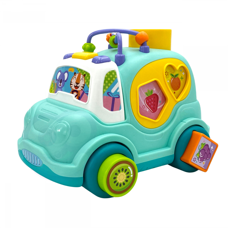 Na bokach samochodzika znajdują się otwory w różnych kształtach, do zabawki dołączone są kolorowe klocki pasujące do tych otworów. Dziecko może bawić się w dopasowywanie klocków do odpowiednich kształtów, co pomoże mu rozwijać koordynację wzrokowo-ruchową i rozpoznawanie kolorów i owoców