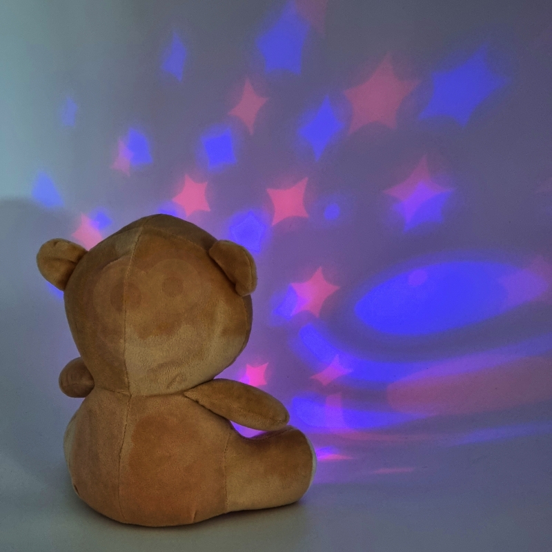 - – efekty świetlne i dźwiękowe – melodie/kołysanki pomagające zasnąć + projektor zmieniający kolory,