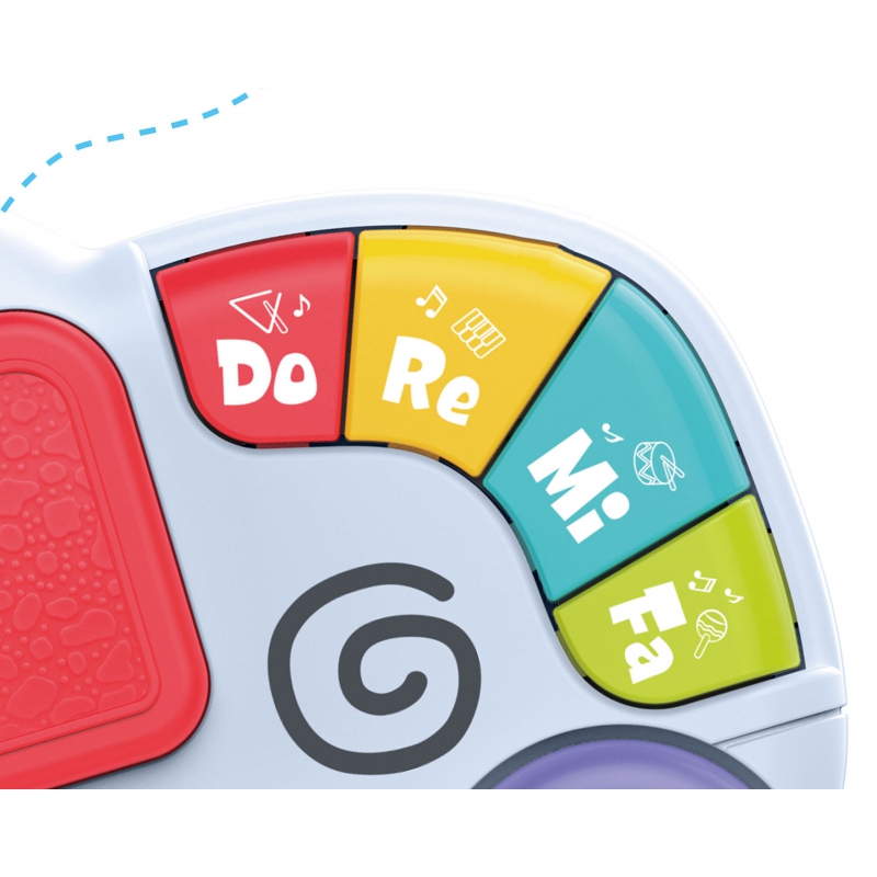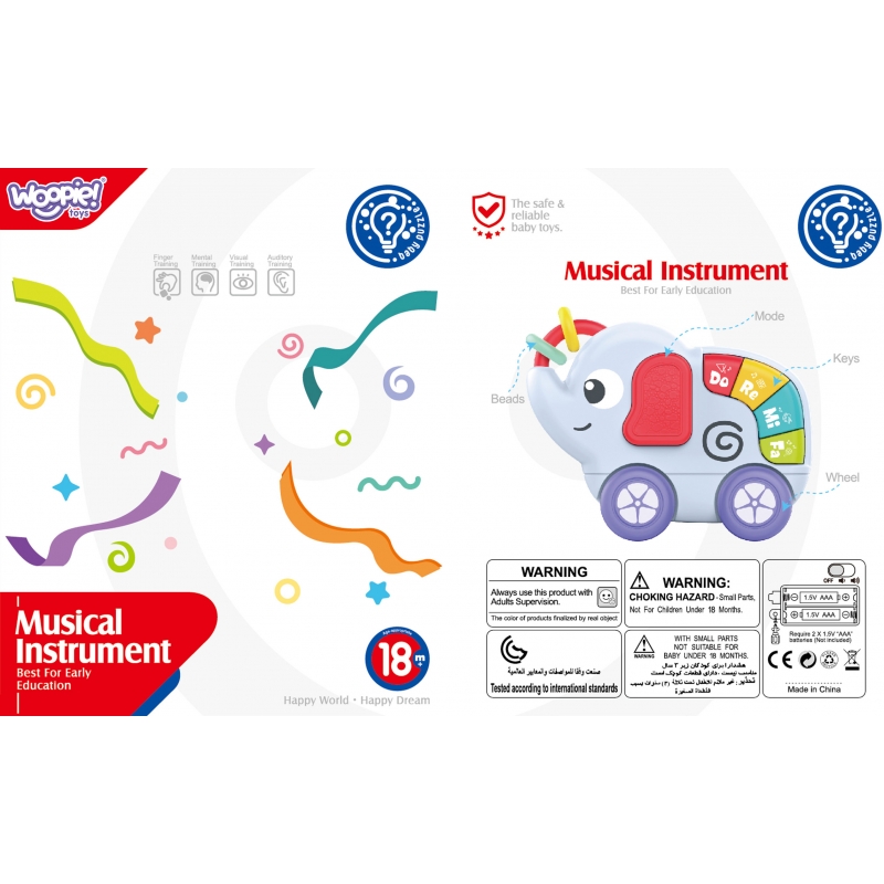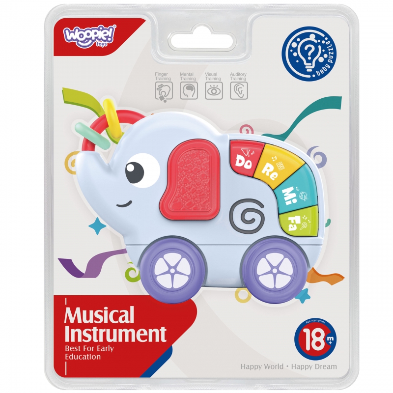 Interaktywny Słonik od marki Woopie do codziennej zabawy i rozwoju młodszych dzieci. Zabawka posiada 2 ruchome kółeczka, które dziecko może przesuwać, 4 kolorowe klawisze po naciśnięciu wydają dźwięki instrumentów muzycznych. Słonik posiada obrotowe kółeczka do pchania i ciągnięcia. Ucho słonika oraz trąba z kółeczkami wykonane są z miękkiego plastiku dzięki czemu zabawka może służyć jako gryzaczek. Maluch poprzez przesuwanie, naciskanie ćwiczy zręczność i koordynację ruchową. Efekty dźwiękowe przykują uwagę każdego dziecka.