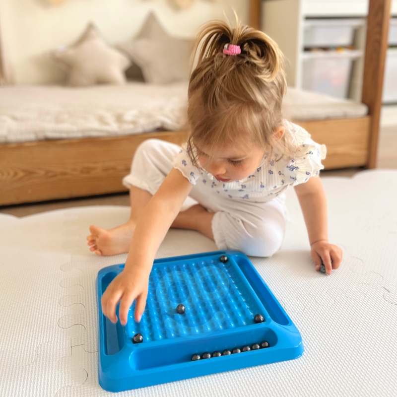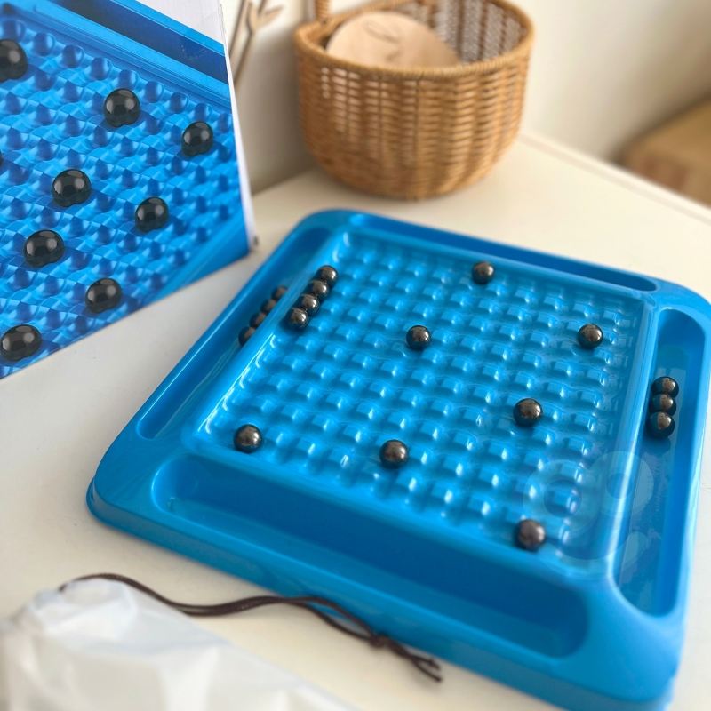 - Zestaw zawiera: 20 magnetycznych kulek, planszę do gry, z 4 półeczkami na magnesy, woreczek na kulki.