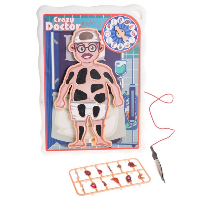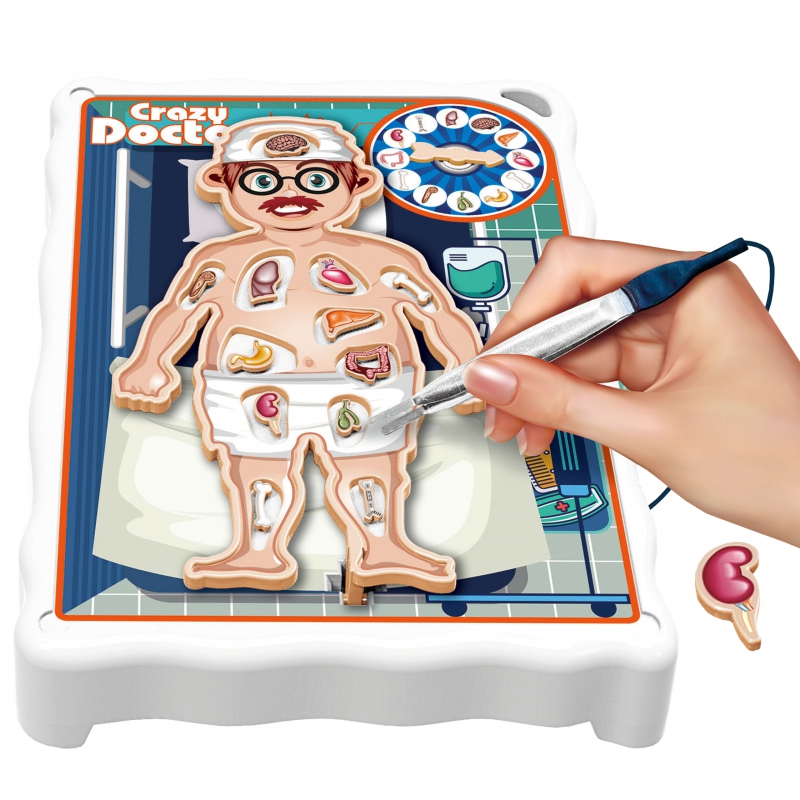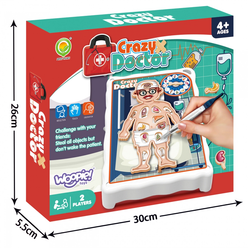 Gra Zręcznościowa Szalony Lekarz od marki WOOPIE. Gra przeznaczona dla dzieci od 4-ego roku życia, w której wcielamy się w doktora i przeprowadzamy operację. Organy umieszczamy w pacjencie, a następnie kręcąc na kole dowiadujemy się jaki organ musimy „usunąć”. Należy to robić bardzo precyzyjnie, ponieważ gdy tylko dotkniemy organem naszego pacjenta on zadrży co prowadzi do przegranej. Gra rozwija koordynacje wzrokowo-ruchową, doskonali precyzje, cierpliwość i skupienie.