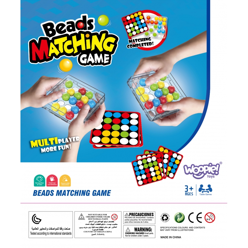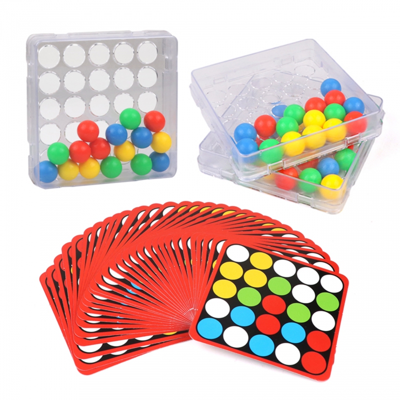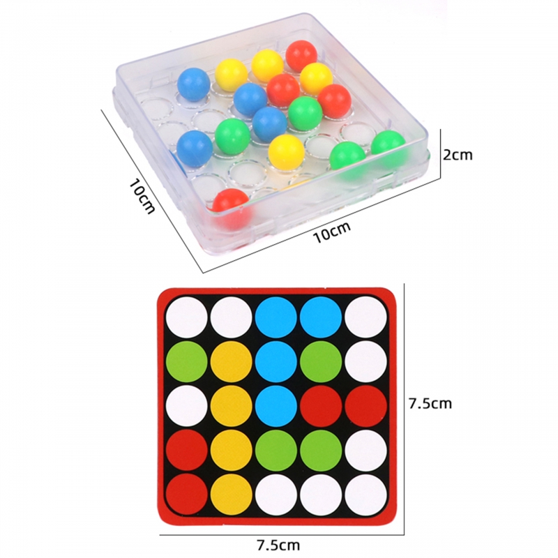 Podstawka z kolistymi otworami umożliwia przesuwanie kolorowych kulek w środku pudełka wyłącznie za pomocą palcy.Każda karta dodatkowo zawiera na odwrocie uniwersalny czarno-biały szablon do pokolorowania i stworzenia przez dzieci własnej mozaiki.