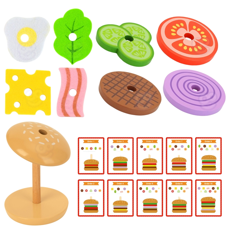 Dziecko wybiera potrzebne składniki, a następnie patrząc na grubość i kolor układa składniki zgodnie z kolejnością. Zabawę można urozmaicić o grę w zapamiętywanie i odtwarzanie z pamięci obrazka przez malucha. Można również zakryć na karcie składniki, a dziecko na podstawie samego wyglądu może dobrać potrzebne składniki i ułożyć hamburgera. Dziecko może również wymyślić swój własny wygląd burgera – ogranicza tylko kreatywność i wyobraźnia