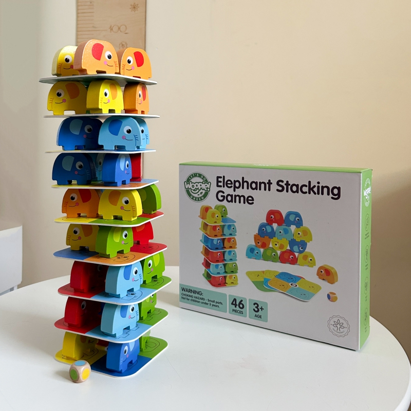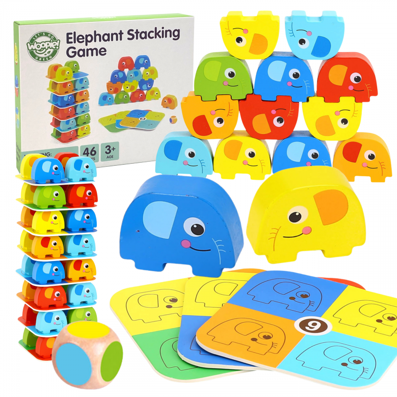 Słonik na Słoniku od marki WOOPIE GREEN to wyjątkowa gra zręcznościowa, która zapewni mnóstwo śmiechu i emocji! Zestaw składa się z 46 kolorowych, drewnianych elementów – w tym kostki i kart – dzięki czemu można bawić się na różne sposoby: układać słonie w wieżę lub rozegrać emocjonującą rundę w stylu Jenga. Wyraziste kolory i uroczy design przyciągają uwagę dzieci, a zaokrąglone kształty sprawiają, że zabawa jest w 100% bezpieczna już od 3 roku życia.