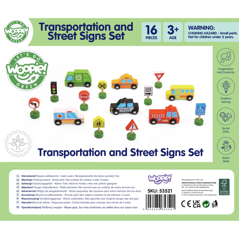WOOPIE GREEN Zestaw Drewnianych Pojazdów i Znaków Drogowych 15 el.