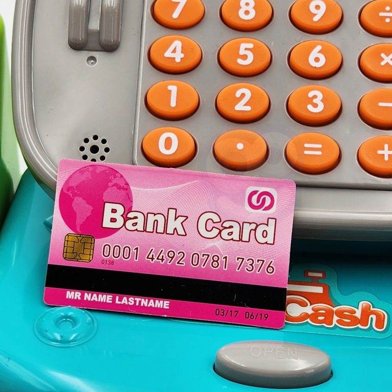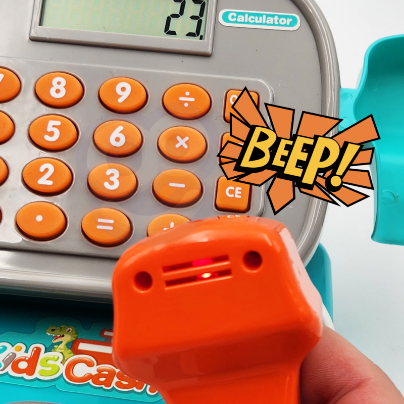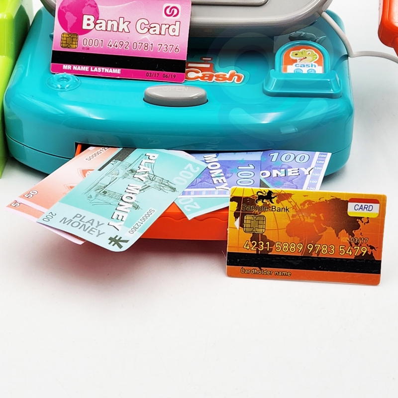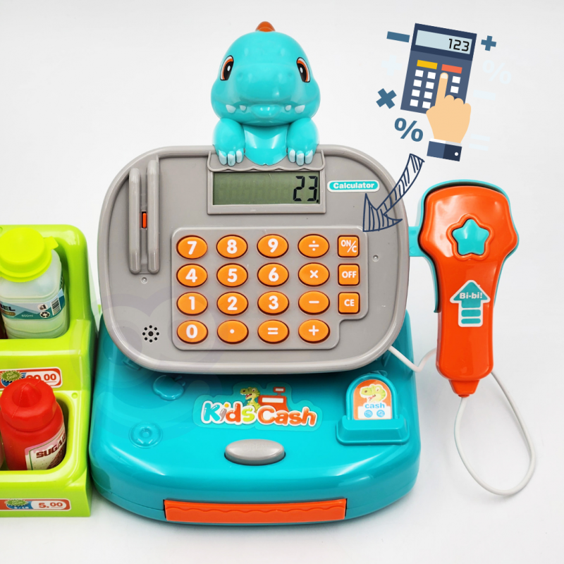- – kasę sklepową z kalkulatorem i otwieraną kasetka na przechowywanie pieniążków,