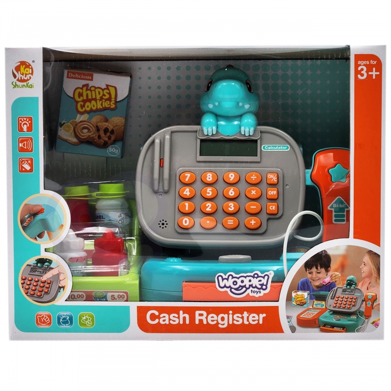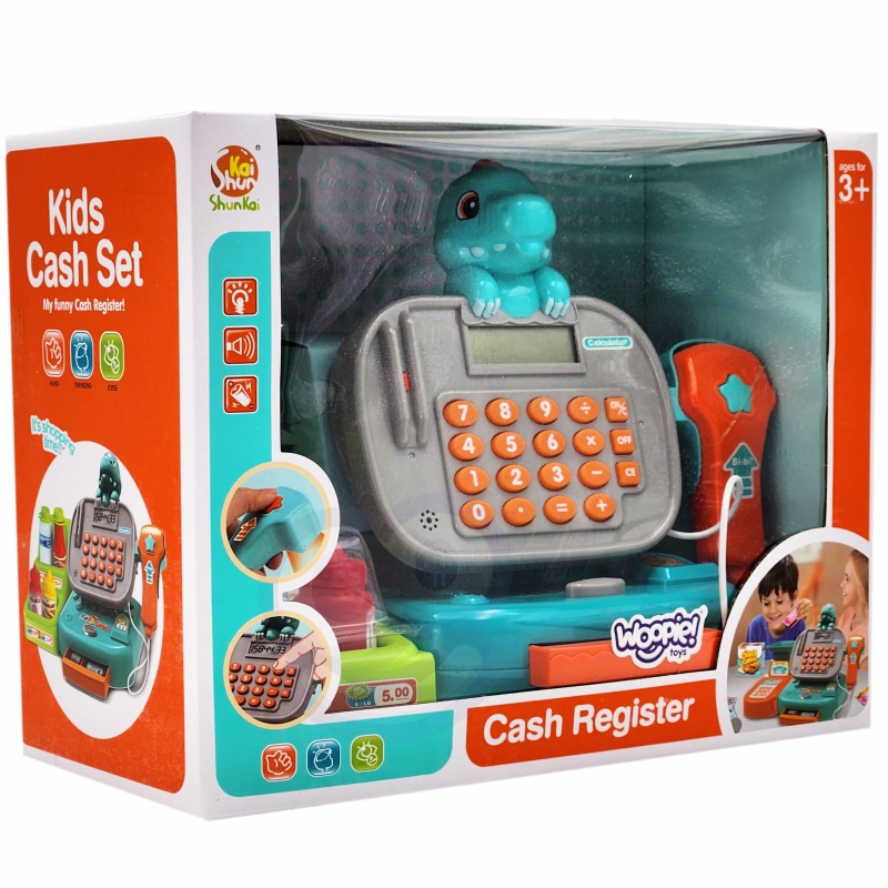 Kasa sklepowa Dino z Półką od marki WOOPIE to idealna propozycja zabaw. Dzieci mogą wybrać produkty, które chcą kupić, a następnie nabić je na kasę. Przy pomocy czytnika zeskanują ciasteczka i inne produkty. Następnie kupujący może zapłacić pieniążkami lub kartą płatniczą.