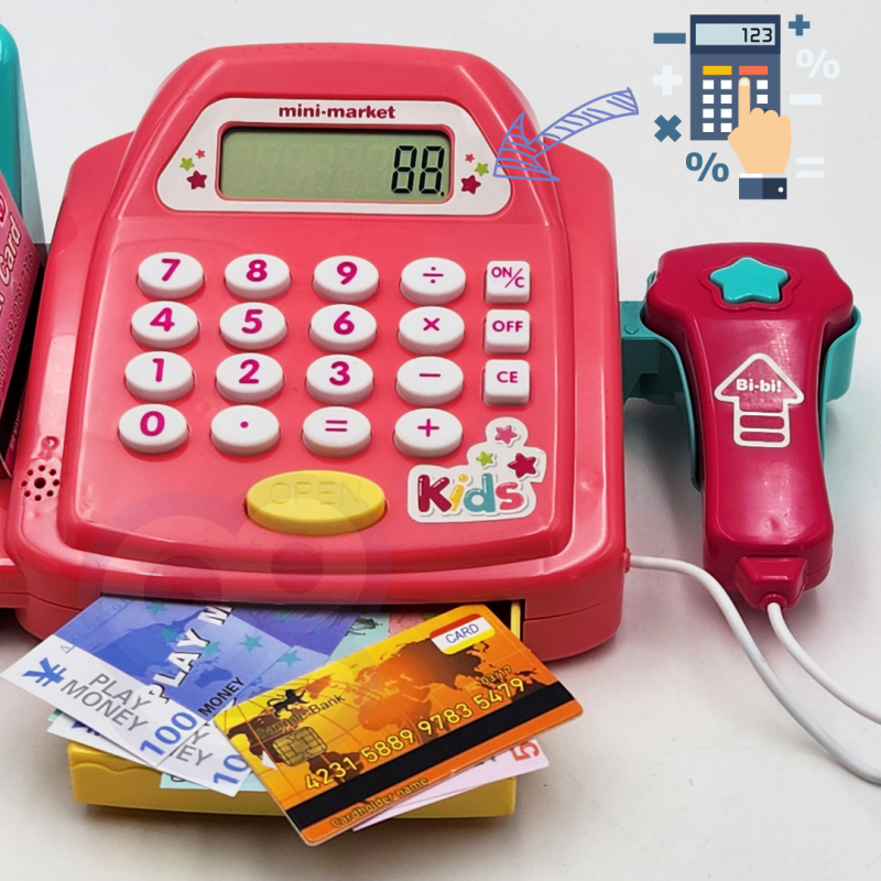 • – kasę sklepową z kalkulatorem i otwieraną kasetka na przechowywanie pieniążków
