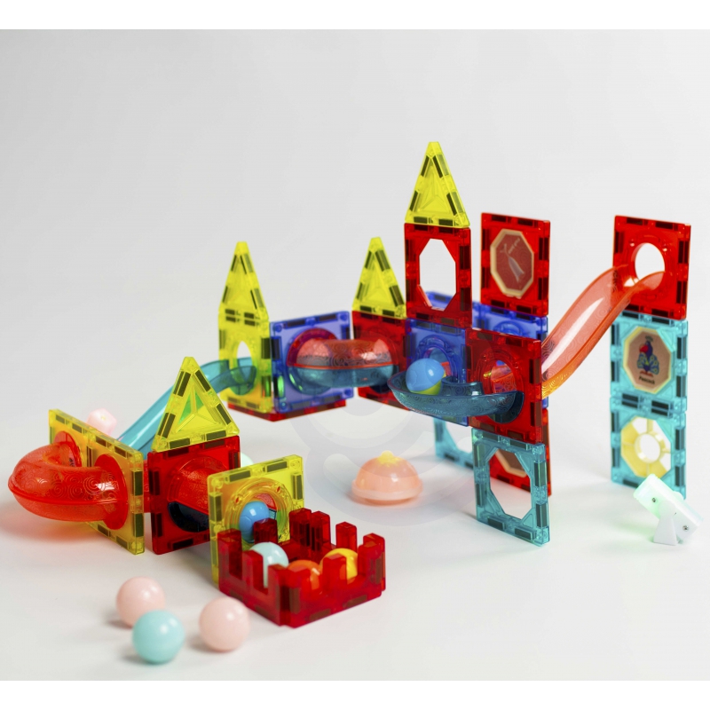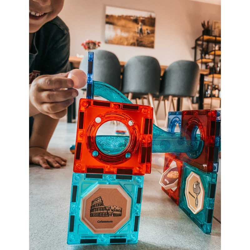Klocki Magnetyczne od marki WOOPIE zwrócą uwagę i zafascynują Twoje dziecko. Klocki w bardzo łatwy sposób łączą się ze sobą, można z nich stworzyć wspaniałe konstrukcje ze zjeżdżalniami np. tor po którym przemieszcza się kulka. Tor można podświetlić dołączoną latarką, aby robił jeszcze większe wrażenie, a samo dziecko może wtedy zaobserwować jak przemieszcza się światło, co rozwinie u niego percepcję. Samo ułożenie toru tak, aby kulki bez problemu dochodziły do końca rozwinie u dziecka logiczne myślenie, wyobraźnie, kreatywność oraz pomoże dziecku skoncentrować się podczas tworzenia konstrukcji. Przez układanie klocków dziecko poznaje kształty i kolory oraz ćwiczy zdolności manualne tzw. motorykę małą.