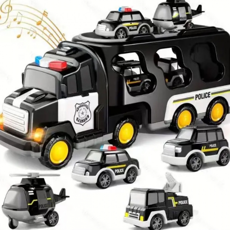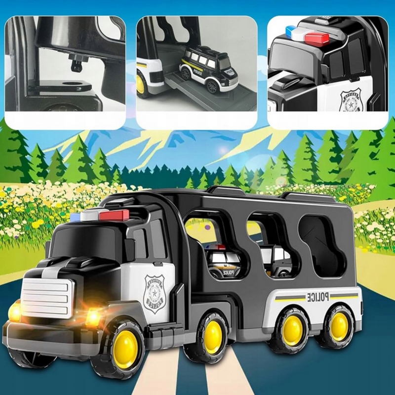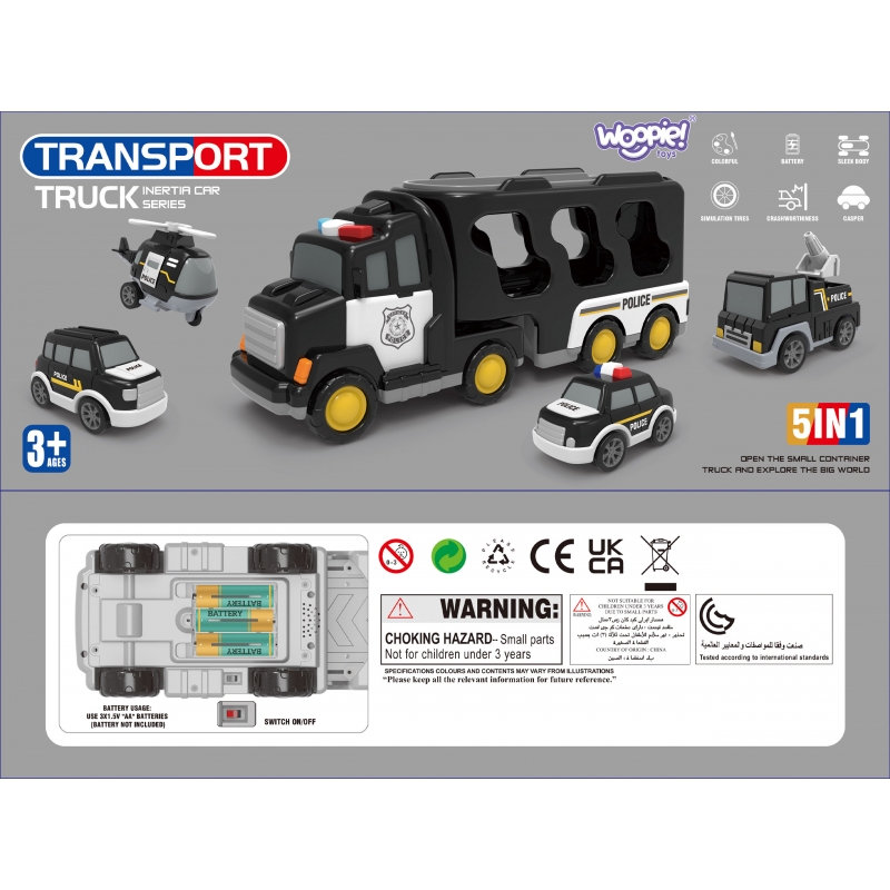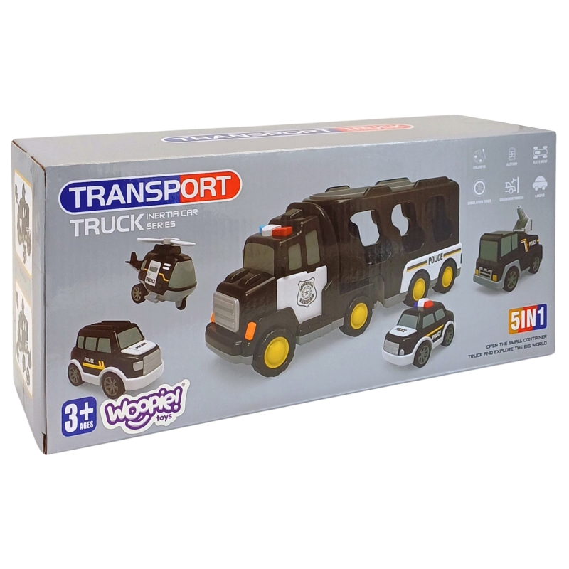 Duży Zestaw Policyjny Ciężarówka + 4 Auta od Marki Woopie Zaprojektowana z myślą o małych pasjonatach Policji, ta zabawka 5 w 1 to idealny zestaw dla każdego małego ratownika! Naciśnij przycisk na górze kabiny ciężarówki, aby zobaczyć jasne migające światła i usłyszeć realistyczne syreny, bardzo atrakcyjne dla dzieci. Zestaw zawiera dużą ciężarówkę transportową oraz cztery pojazdy policji: samochód opancerzony, ciężarówkę z armatką wodną, helikopter, radiowóz. Każdy z pojazdów ma ruchome elementy, które pozwolą Twojemu dziecku poczuć się jak prawdziwy bohater podczas akcji ratunkowych! Zestaw jest świetnym pomysłem na prezent urodzinowy, świąteczny czy na inne okazje.