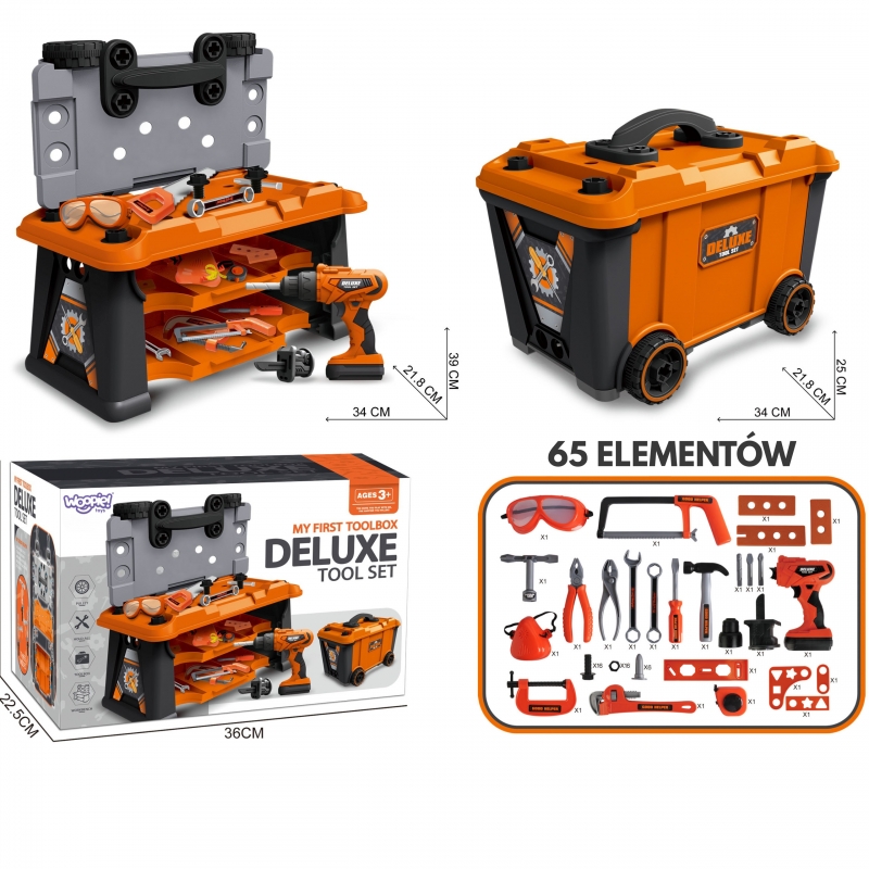 Mobilna Skrzynia Na Narzędzia Warsztat 2w1 Wykonana z solidnych tworzyw sztucznych z pomarańczowo-czarno-szarymi elementami, w łatwy i bezpieczny sposób pozwala dzieciom wcielić się w rolę prawdziwego fachowca. Ten funkcjonalny zestaw 2w1 to nie tylko warsztat, ale również walizka na kółkach, która stanie się ulubionym kompanem zabaw. Ten praktyczny zestaw wspiera kreatywną zabawę w odgrywanie ról i pozwala dzieciom na rozwijanie umiejętności manualnych poprzez zabawę.