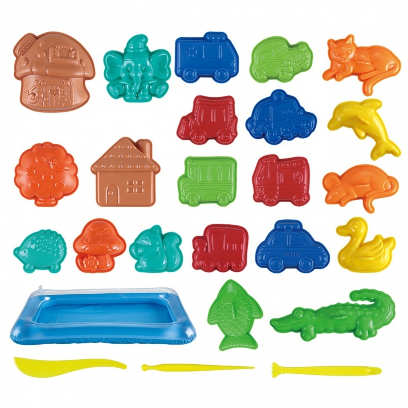 - – Duży wybór foremek (m.in. zwierzęta: słoń, delfin, aligator, ryba; pojazdy: samochód, pociąg; budynki: dom, grzyb)