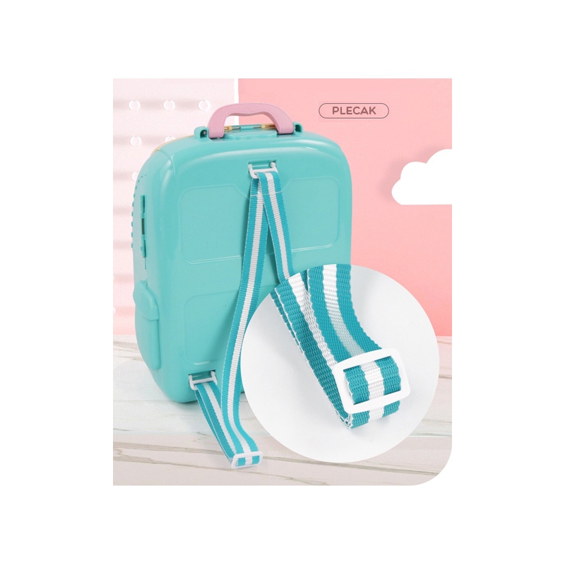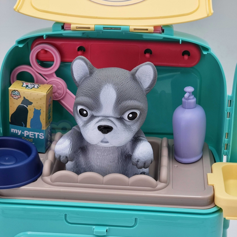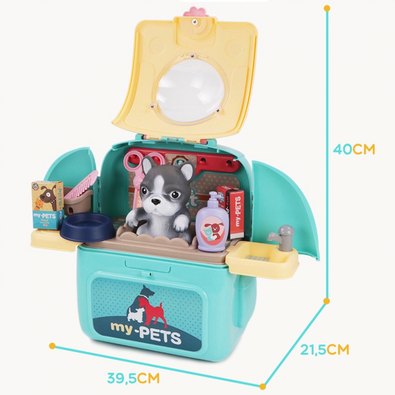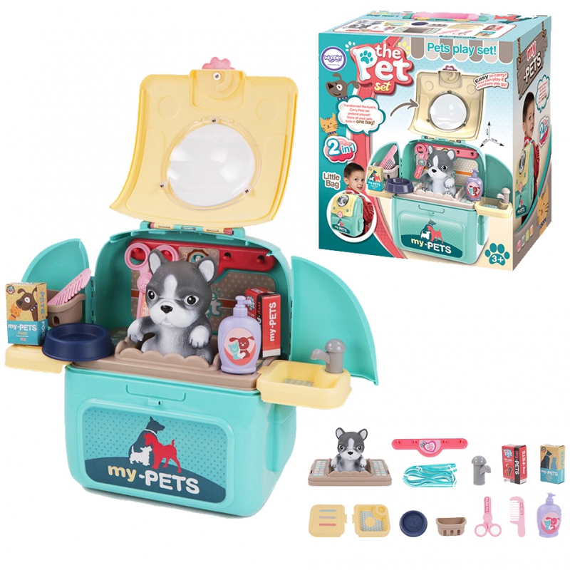 Przenośny Zestaw Pielęgnacyjny dla Pieska od marki WOOPIE pozwoli Twojemu dziecku zadbać o swojego ulubionego pupila. Możesz wszędzie zabrać swojego pieska w wygodnym przenośnym plecaku: w podróż, na plac zabaw czy do przedszkola. Plecak posiada uchwyt do podnoszenia oraz specjalne zamknięcie, które nie pozwoli otworzyć się kabinie podczas noszenia i zapewni maksymalne bezpieczeństwo zwierzakowi. Zestaw pielęgnacyjny 2w1 zawiera: figurkę pieska, plecak, pasek (do zakładania kabiny na plecy), miskę, nożyczki, grzebień, koszyk na akcesoria, 2 pudełeczka na karmę, szampon, zlew, kran, półka i wieszak. Zestaw zawiera wszystko co potrzebne do pielęgnacji pupila. Dziecko może umyć i nakarmić swojego pieska. Dziecko wcielając się w opiekuna lub weterynarza rozwija swoją wyobraźnie oraz poczucie empatii. Możliwe, że zabawka będzie początkiem do rozwinięcia pasji i drogi do zostania weterynarzem.