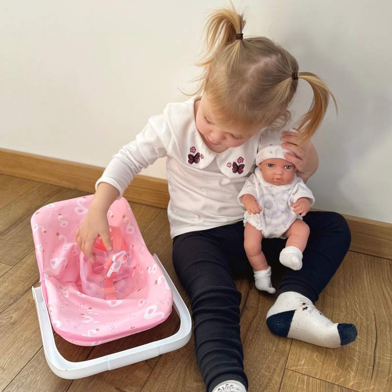 Bobas w podróży Lalka od marki WOOPIE ROYAL– Twoja Nowa Przyjaciółka do Zabawy! Laleczka ubrana jest w śliczny komplet ubrań, pasujące do niego skarpetki oraz czapeczkę. Dodatkowo do zestawu dołączone jest urocze nosidełko w pięknym różowym kolorze. Dziecko rozwija kreatywność dzięki zabawą w odgrywanie ról. Uczy się empatii, wrażliwości czy nawet odpowiedzialności.