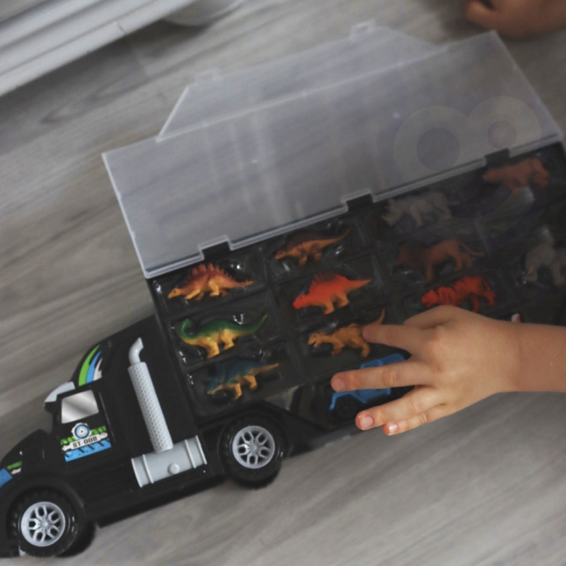Ciężarówka od marki Woopie pełni funkcję lawety, wyrzutni i walizki do przechowywania zwierząt i pojazdów. Zestaw zawiera ciężarówkę, 6 dinozaurów, 6 zwierząt, mały samochód oraz helikopter. Duża ciężarówka o długości aż 50 cm. Dwustronna laweta w formie walizki zawiera 24 miejsca do przechowywania zwierząt lub pojazdów a zamykane ścianki przyczepy chronią przed możliwością zgubienia. Kabina ciężarówki pełniąca funkcję wyrzutni daje dużo frajdy. Zestaw przypadnie do gustu małym miłośnikom zwierząt i pojazdów.