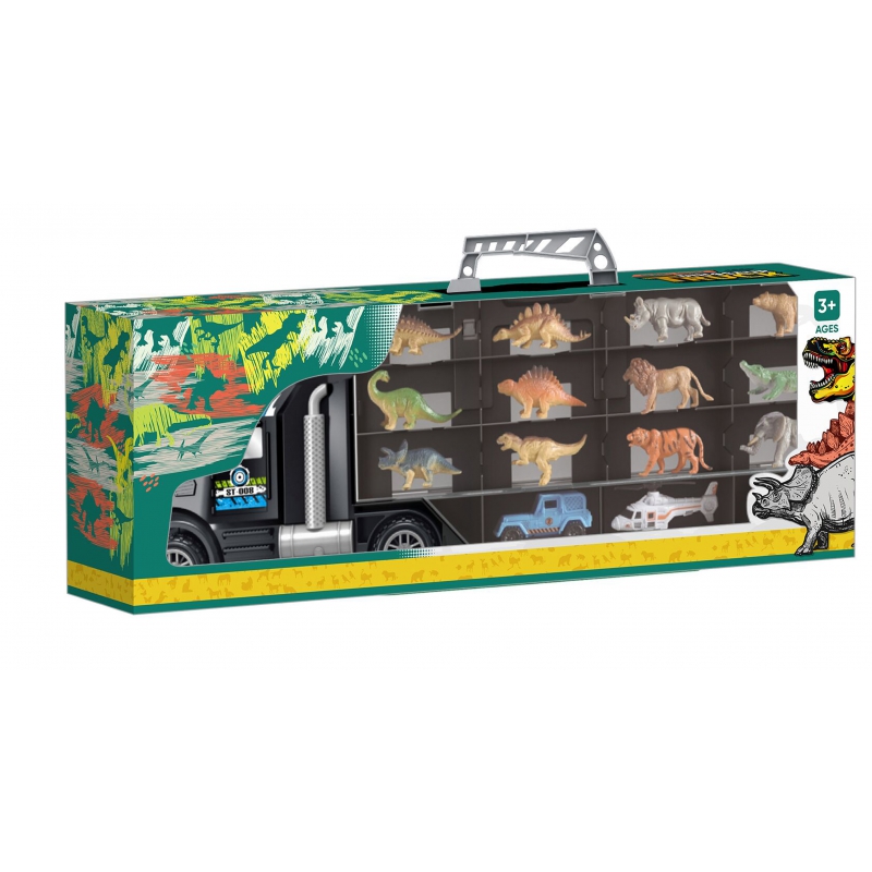 - – zestaw zawiera samochód ciężarowy, 6 dinozaurów, 6 zwierząt, mały samochód i helikopter