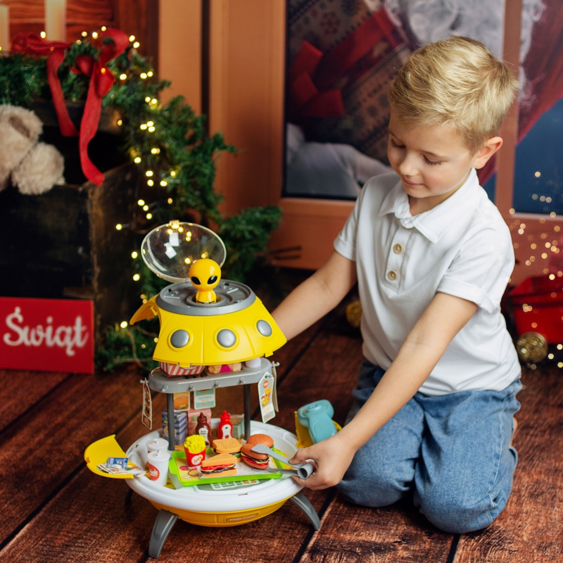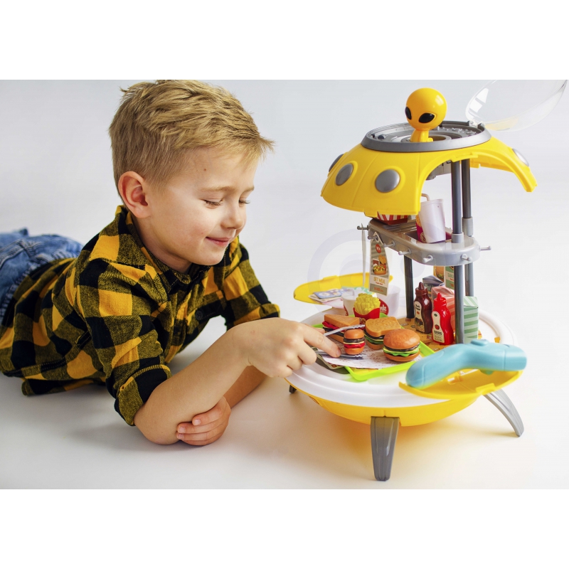 Fast Food UFO od marki WOOPIE to kosmiczny zestaw dla każdego dziecka! Zabawka posiada 3 funkcję. Można włączyć projektor i uczyć się nazw planet. Można użyć jej jako stylowy plecak z marsjaninem. Podczas noszenia plecaka głowa marsjanina swobodnie porusza się za szybką statku. Jednak najważniejsza funkcją jest możliwość rozłożenia statku kosmicznego w super restaurację Fast food. Dziecko może wcielić się w sprzedawcę na marsie i bawić się wspólnie z przyjaciółmi. Zestaw zawiera aż 60 elementów: wszystkie potrzebne rzeczy, które posiada każdy fast food. Małego kosmitę można złożyć. Funkcja plecaka pozwoli wszędzie zabrać swoją własną przenośną restaurację. Odgrywanie ról i naśladowanie zawodów rozwija świadomość Twojego dziecka oraz pobudza wyobraźnie i kreatywność.