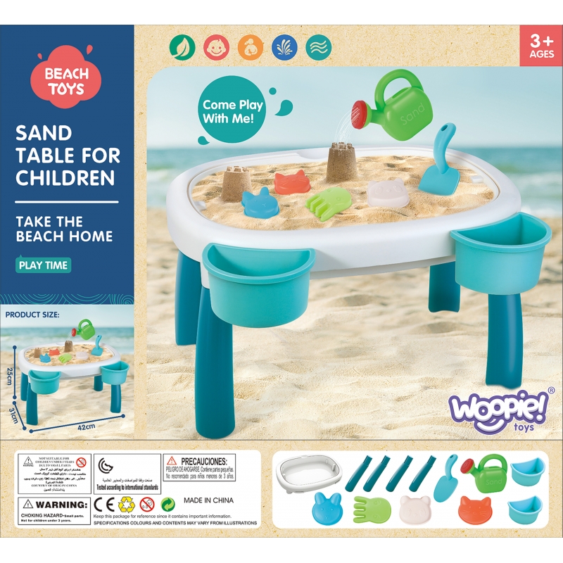 Stół Do Piasku od marki WOOPIE jest idealną zabawka do zabawy z wodą i piaskiem. Zestaw zawiera 7 el: stolik z wyciąganymi nóżkami i 2 pojemnikami, 4 foremki (ośmiornicę, kotka, pandę i króliczka), konewkę i łopatkę. Zestaw jest przeznaczony do zabawy w domu i na plaży lub piaskownicy.