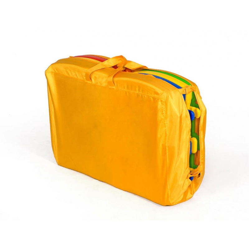 – Płotek można zdemontować i złożyć w torbę, która jest jednocześnie podłogą kojca w celu przewiezienia lub przechowania.