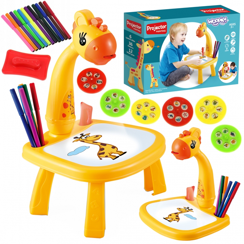 Rozbudź wyobraźnię swojego dziecka z uroczym projektorem do rysowania marki Woopie! To kolorowy i interaktywny stolik w kształcie żyrafy wyposażony w projektor oraz tablicę suchościeralną wbudowaną w blat. Stolik wyświetla kolorowe obrazki, a dziecko odrysowuje je na kartce lub na tablicy. Lekka konstrukcja, bajkowy wygląd oraz dołączone mazaki i wzory sprawiają, że rysowanie staje się ulubioną zabawą każdego malucha.