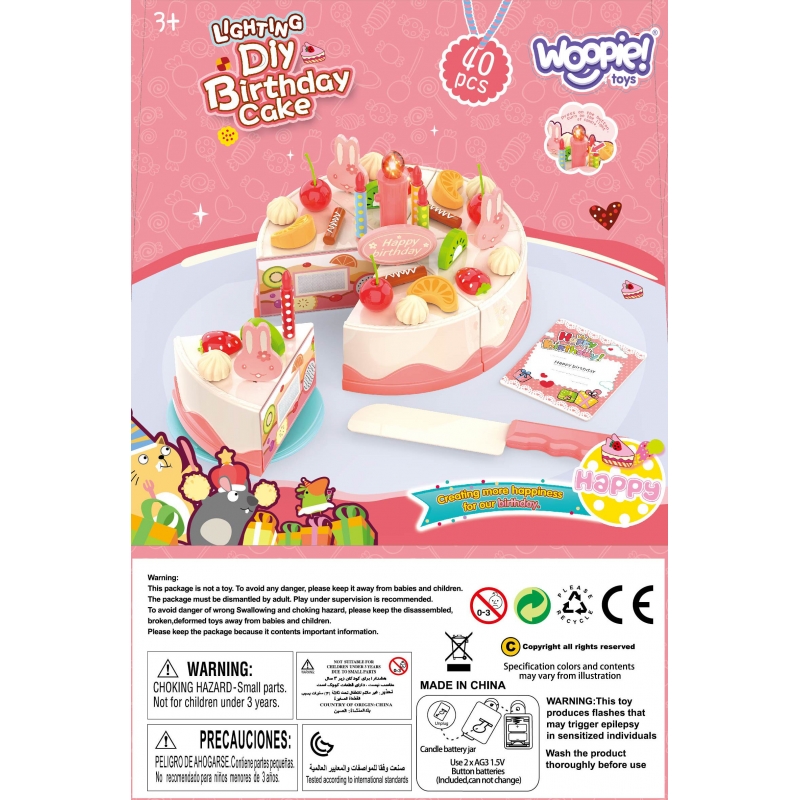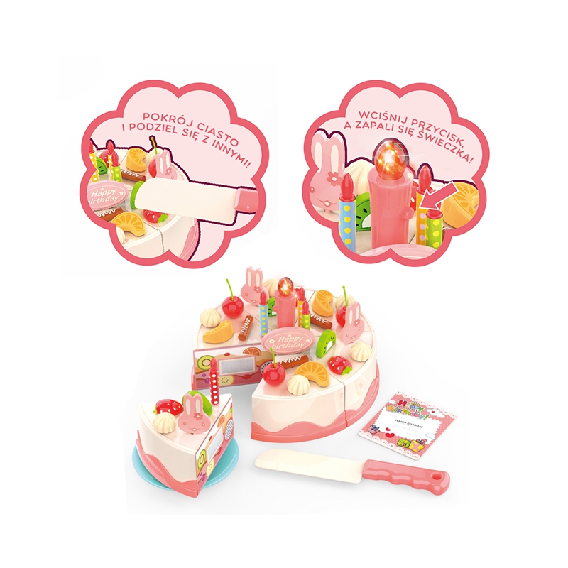 Tort urodzinowy od renomowanej marki Woopie to idealna propozycja na spotkania z przyjaciółmi. Zestaw będzie idealnym atrybutem każdej małej gospodyni czy każdego małego gospodarza do zorganizowania niezapomnianego przyjęcia. W zestawie znajdziemy pięknie udekorowany tort, który możemy pokroić na 6 kawałków i poczęstować swoich gości. Dziecko może dekorować tort według własnych pomysłów dzięki dołączonym do zestawu świeczekom, ozdobom w kształcie króliczka i owocom. Na środku tortu znajduje się świeczka, która po naciśnięciu przycisku zapala się. Z takim zestawem zabawie nie będzie końca!