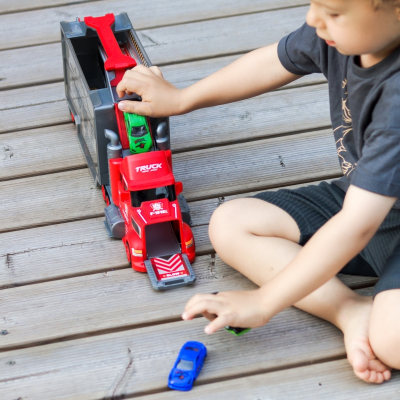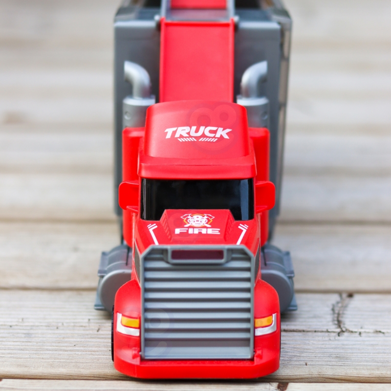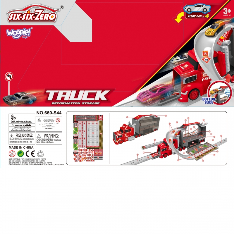Zestaw Six-Six-Zero to wielofunkcyjna zabawka, która w jednej chwili może pełnić rolę klasycznej ciężarówki transportowej, a po rozłożeniu zamienia się w rozbudowany tor wyścigowy z katapultą. Główna część zestawu to duża, efektowna ciężarówka stylizowana na pojazd strażacki, która pełni funkcję zarówno pojazdu transportowego, jak i przenośnej walizki na samochodziki i akcesoria. Po otwarciu naczepy i rozłożeniu elementów, użytkownik zyskuje dostęp do garażu oraz toru wyścigowego, na którym można organizować emocjonujące wyścigi i pojedynki samochodowe.